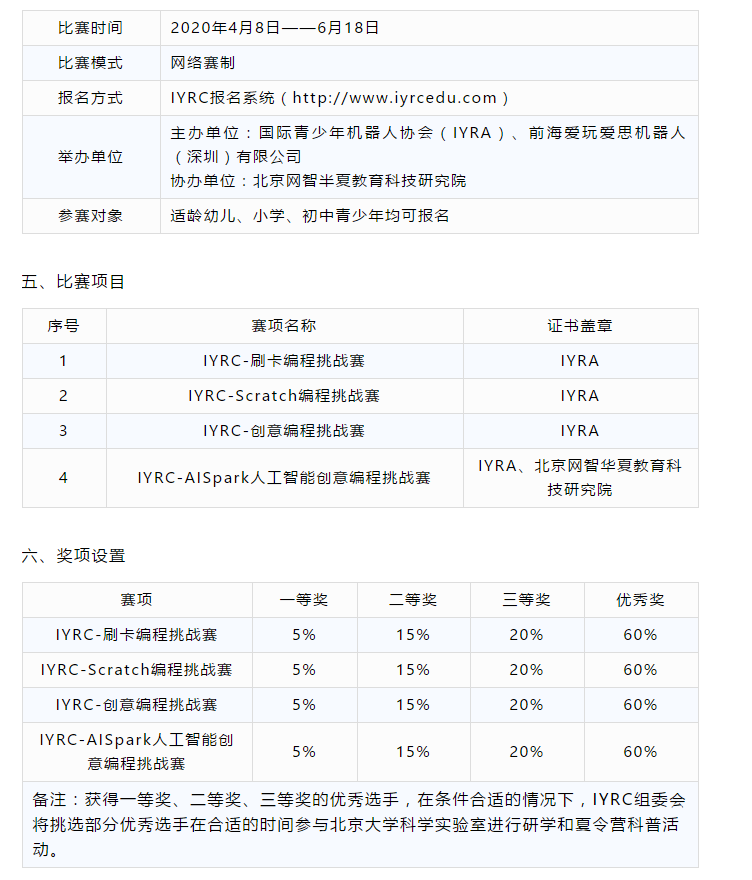 綜合考慮到參賽選手培訓計劃及后續組織,2020IYRC國際青少年機器人競賽(中國)首屆線上賽,IYRC組委會經討論決定了本屆比賽賽程安排,具體如下: