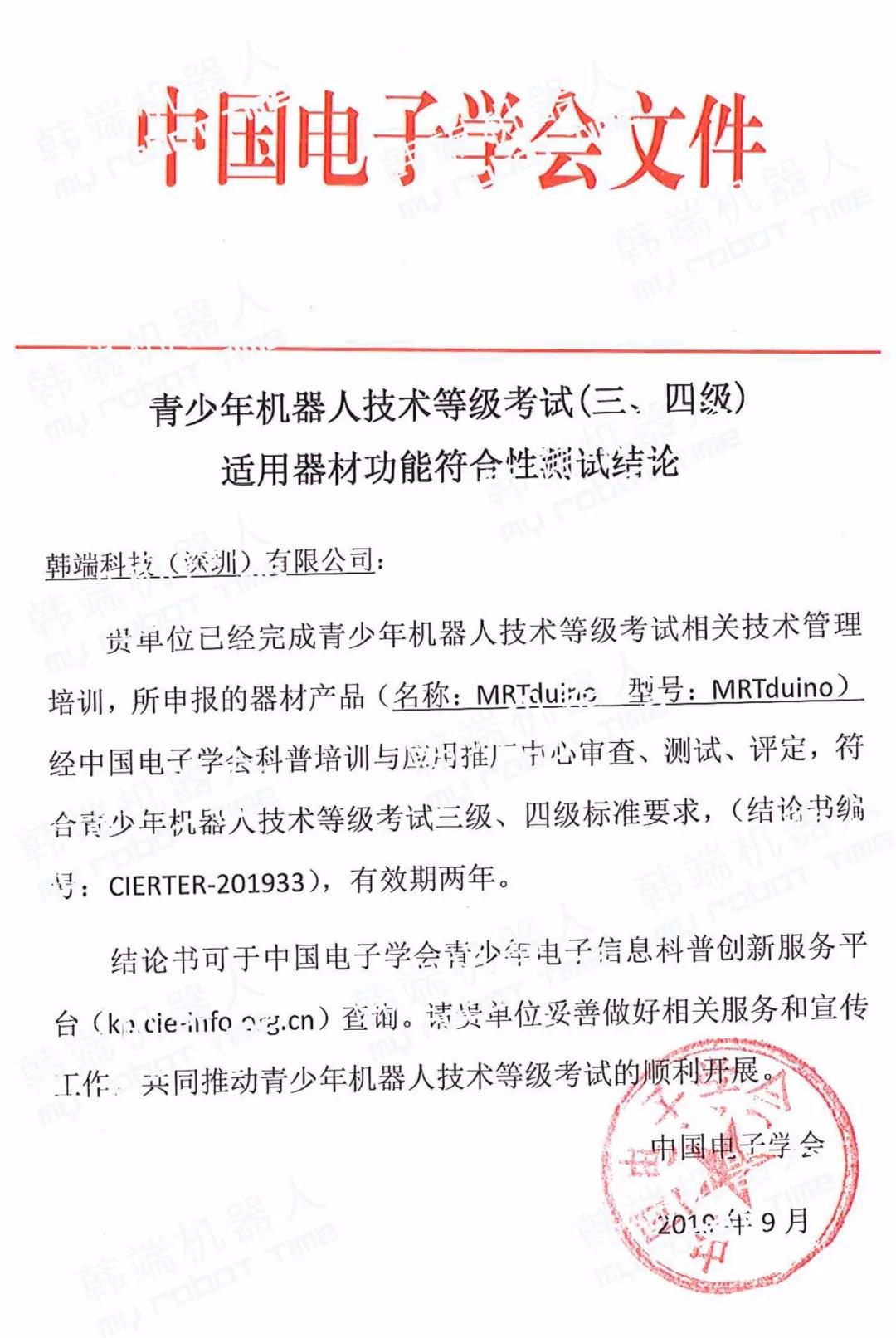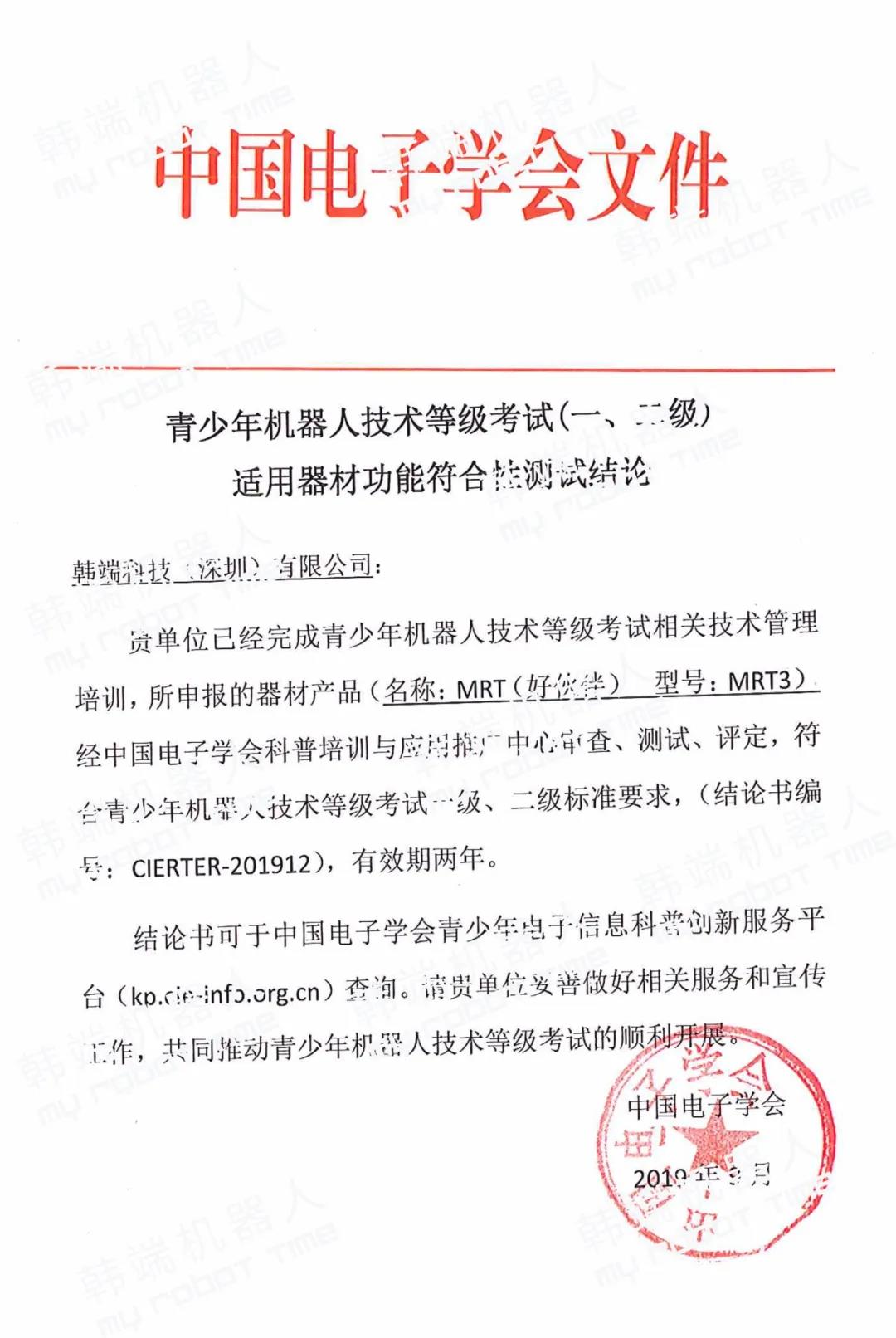 2019年韓端機器人產品經評審被認定為全國青少年機器人技術等級考試符合性器材,以下為電子學會授權文件以及1-2級等級套裝簡介: