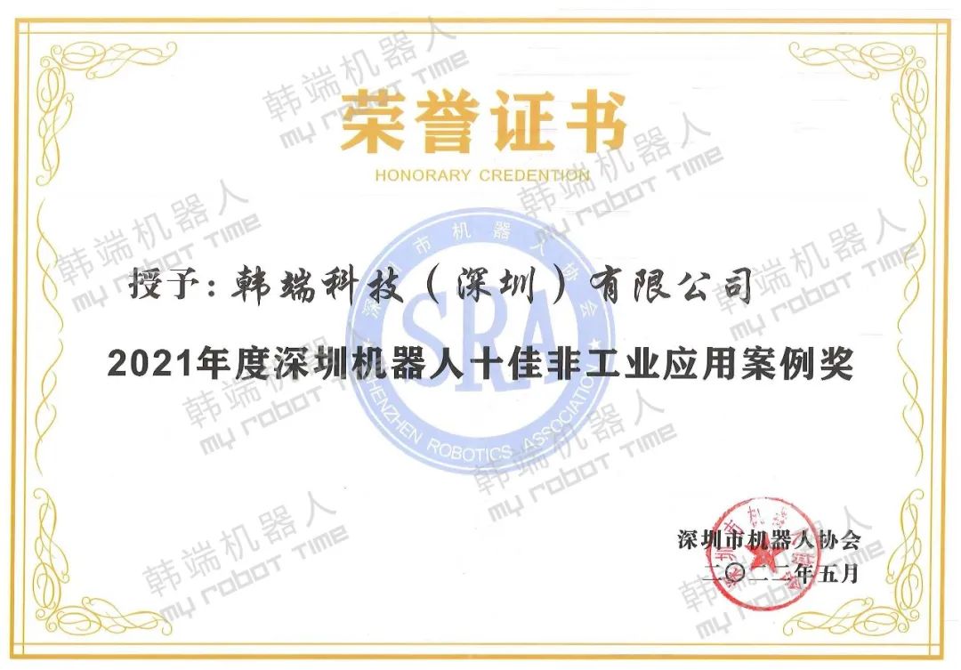 2021深圳機器人年度評選頒獎典禮舉辦,韓端科技榮獲“十佳非工業(yè)應用案例獎”!