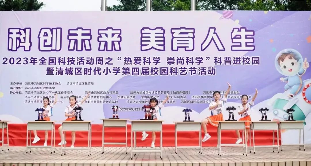 清遠市清城區時代小學隆重舉行“科創未來,美育人生”第四屆科技藝術節,本次科藝節活動得到了清城區科協、清遠市和清城區教育局、廣州美術學院、清遠職業技術學院、中國工程師社團聯盟(深圳市工程師聯合會)、深圳韓端機器人公司、廣州市云蝶科技有限公司、廣州市泰歌會、清遠市水文局、清遠市氣象局等單位的大力支持。