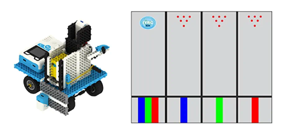 用戶將機器人放置在起始點位置,通過顏色傳感器識別不同顏色彈道并進行擊打,機器人出發后識別移動到指定顏色彈道,停下來擊打道具;然后回起始點位置,切換程序再出發,移動到指定顏色彈道,停下來擊打道具,然后回到起始點位置。切換程序接著在從起始點出發,移動到指定顏色彈道,停下來擊打道具,然后回到起始點位置,任務完成。