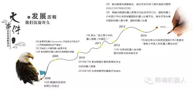 韓端科技(深圳)有限公司是是全球最早從事教育機器人事業(yè)的頂級企業(yè)之一。公司成立于2008年,由韓國、中國、香港三方友好合資經營,業(yè)務涵蓋教育機器人的研發(fā)設計、生產銷售、品牌運營、教研教育、課件開發(fā)五大板塊。作為一家注冊在中國的高新技術企業(yè),公司擁有全球專利、國家發(fā)明專利、實用新型、外觀專利、軟件著作權等知識產權幾百項。公司自成立以來,已持續(xù)在全球推出了HUNA MY ROBOT TIME(MRT)、KICKY、GOMA、BRAIN、CREATIONS、LAND、DINOSAURS、ROBOT HEROES、ROBOT FISH-MIRO、CORE等品牌。