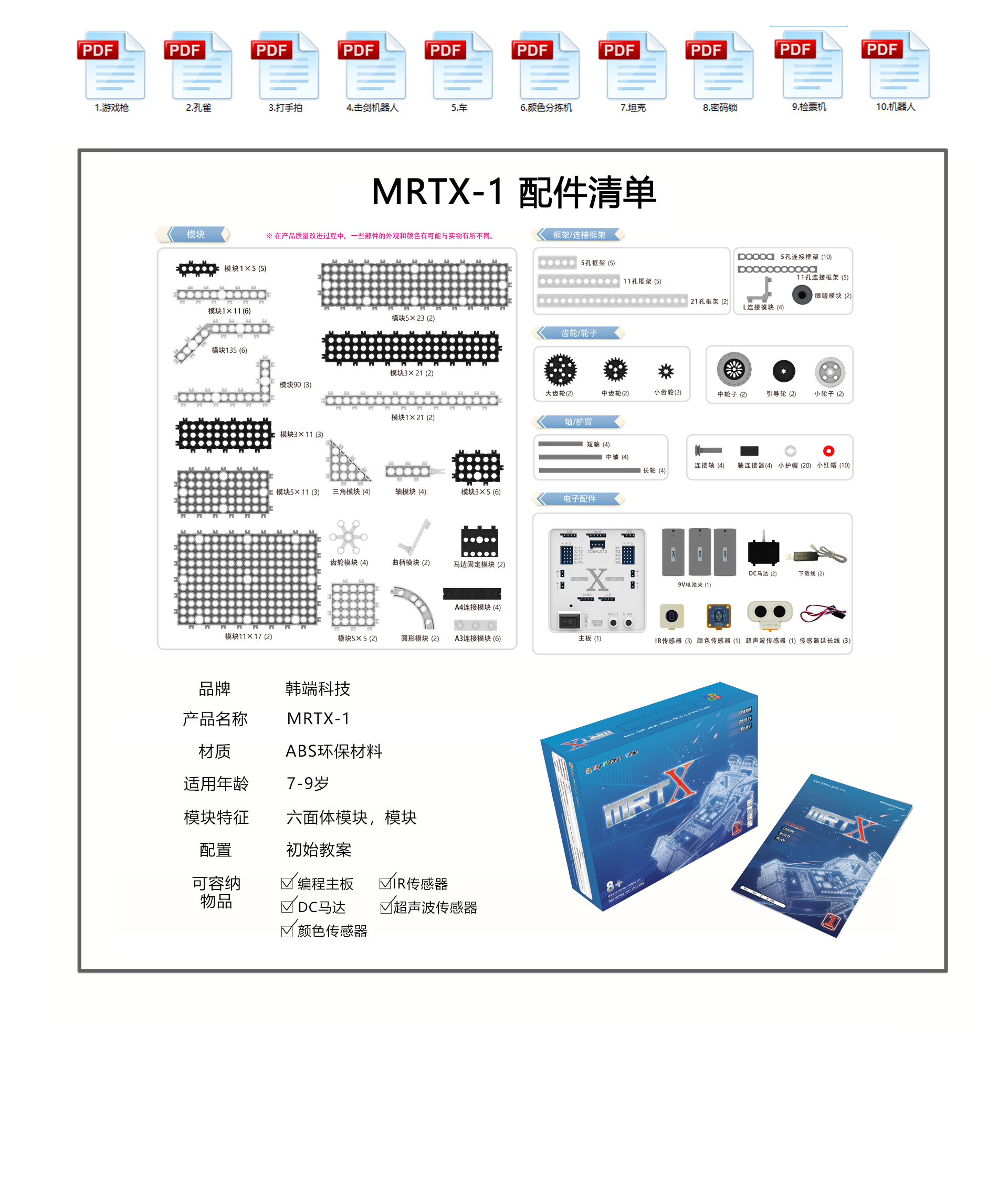 產品名稱:MRTX-1 外觀顏色:多彩積木 產品材料:ABS環保材料 模塊特性:六面體模塊 ,小顆粒 電 機:DC馬達 主 板:編程主板 模型數量:10個 額定電壓:9V 功 能:DIY 教學,動靜結合,形象生動。主板為開關控制模式,一鍵式按鈕設計讓機器人操作顯得簡潔而簡單。適合幼兒初學階段。 適用年齡:7-9歲 重 量:2KG 配 置:原始教材,超聲波傳感器,顏色傳感器,IR傳感器 包裝尺寸:寬250*厚350*高90mm
