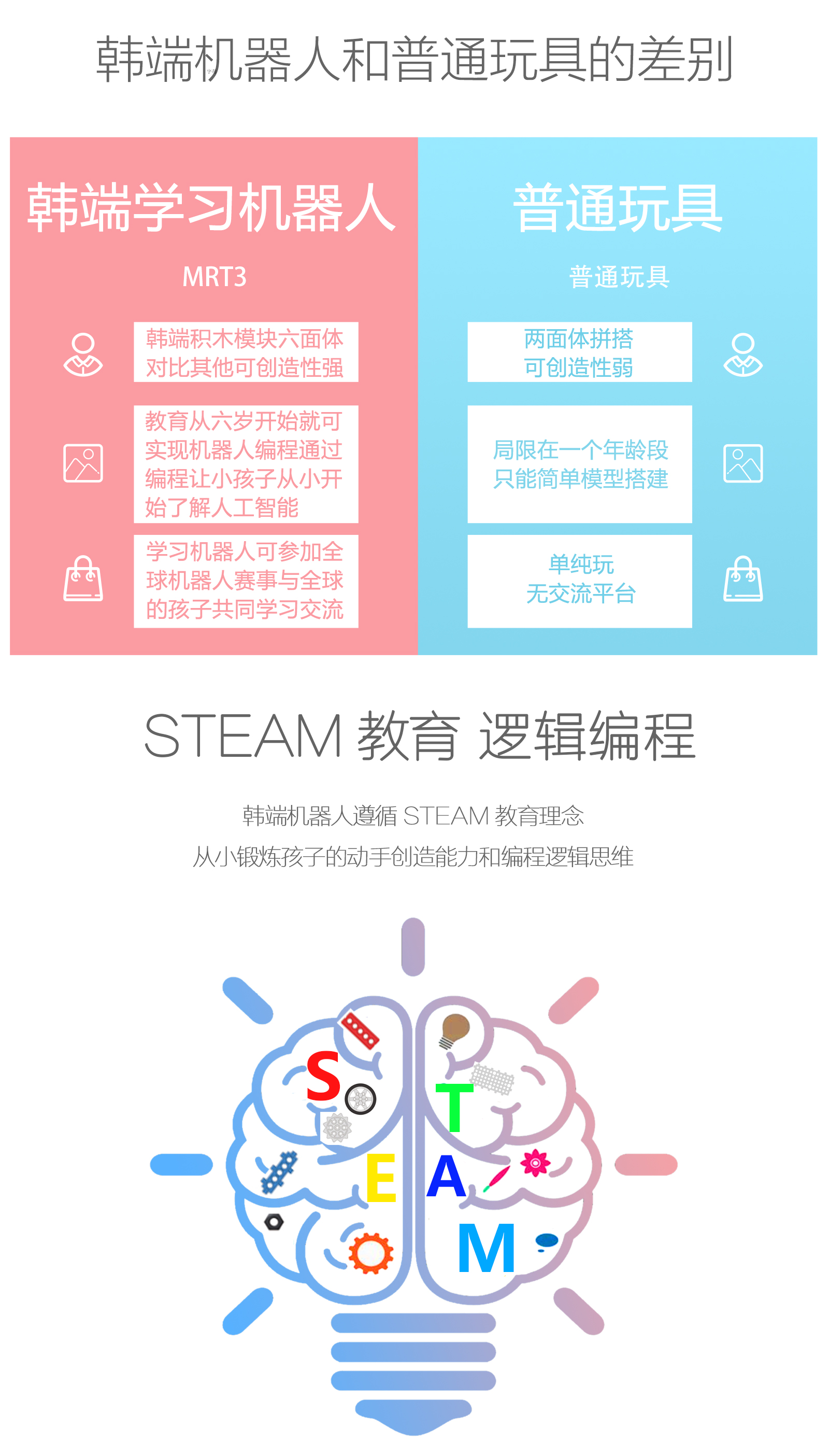 產品參數 產品名稱:MRT3-1 外觀顏色:多彩積木 產品材料:ABS環保材料 模塊特性:六面體模塊,小模塊 電 機:DC馬達*2 主 板:預編程主板,帶LED數碼管顯示,10種模式選擇,2個電機接口,3個輸入 口,3個輸出口 傳 感 器:遙控接收器*1 模型數量:15個(10個動態+5個靜態) 額定電壓:6V (5號電池4節) 功 能:DIY 教學,主板為單片機控制模式,程序已設置完畢,可設置模式,帶遙控器控制。 適用年齡:7-9歲 重 量:1.18KG 配 置:初始教案(英文) 包裝尺寸:寬220*厚280*高90mm 彩盒包裝